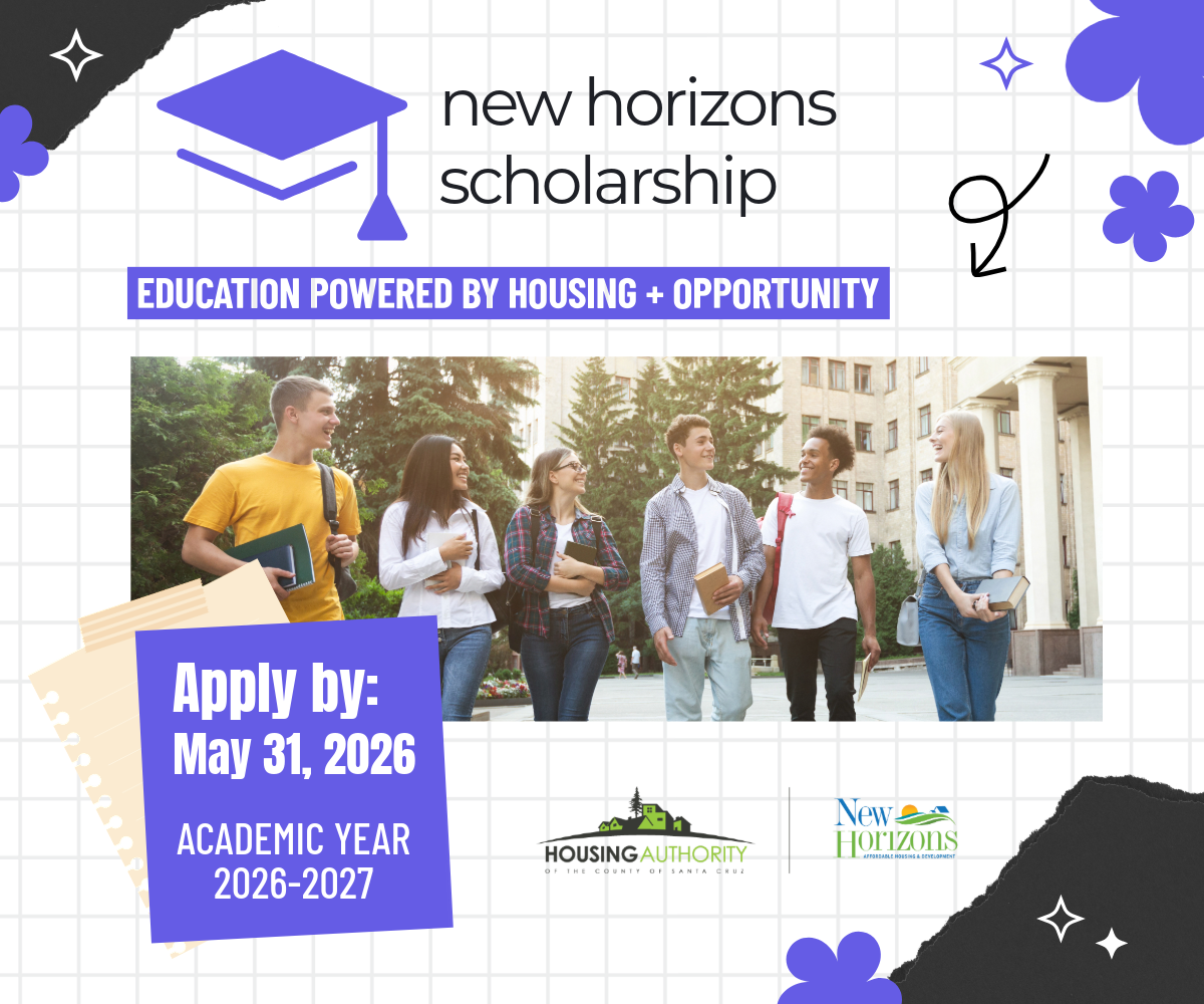 The New Horizons Scholarship provides scholarships of at least $1,000 to individuals and families receiving housing assistance through the Housing Authority of the County of Santa Cruz. By pairing housing stability with educational support, the program helps create momentum toward higher education, career advancement, and long-term opportunity.